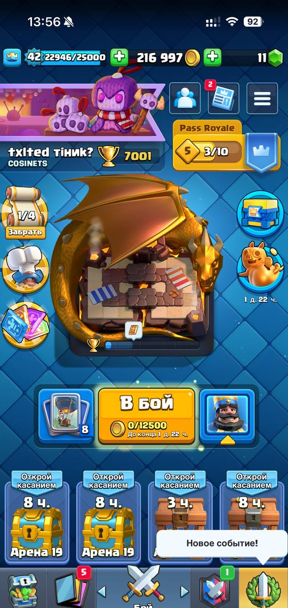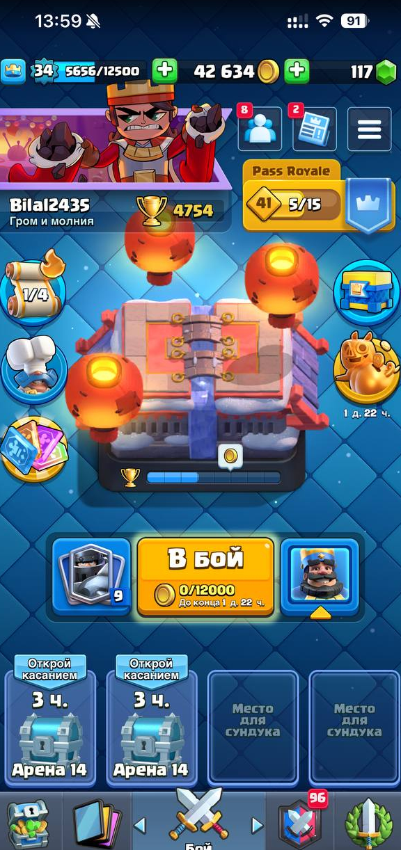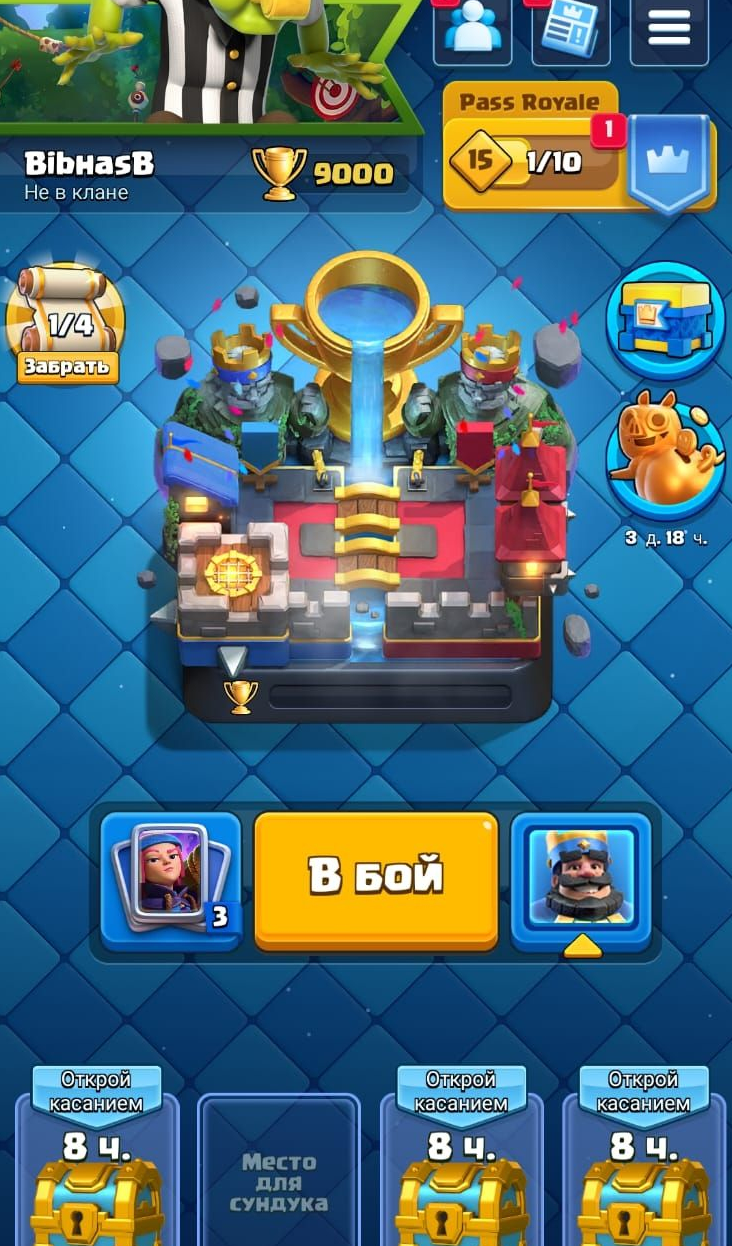 Уровень 26 Трофеи 3863 Лига Искатель 1 Бесплатная смена ника Нет 16гемов 90 карт открыто